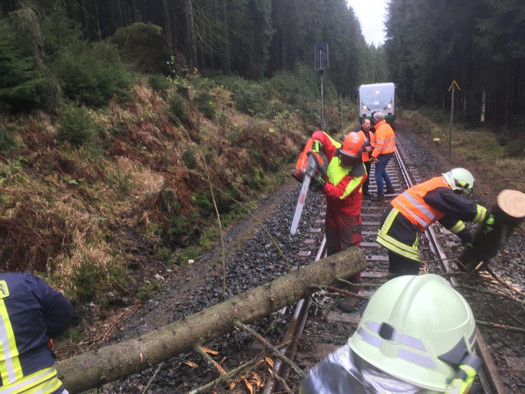 Durch die Bahn wurde die FF Grünbach herangezogen um umgestürzte Bäume auf der Bahnlinie zu beseitigen. Bis Bahnkilometer 5,0 von Falkenstein kommend beseitigte die FF Falkenstein umgestürzte Bäume. Danach bleib wieder ein Triebwagen mit Passagieren kurz vor Grünbach stecken. Wir machten uns zu Fuss vom Haltepunkt Grünbach aus auf den Weg zum Triebwagen und beseitigten den Baum. Danach fuhren wir mit dem Triebfahrzeug bis zum Haltepunkt Muldenberg und beseitigten auf der Strecke weitere 3 Bäume. In Muldenberg übernahm die FF Muldenberg und wir kehrten nach einem langen Einsatz-Tag wieder zum Gerätehaus zurück. Nach einem Kaffee konnte das Equipment gereinigt und wieder fit gemacht werden, und die Einsatzkräfte konnten das Gerätehaus verlassen.