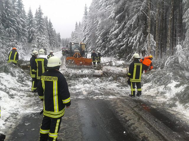 Auf der Staatstraße von Hammerbrücke nach Muldenberg droht eine Fichte auf die Straße zu stützen. Noch ehe das passieren sollte, wurden die Kameraden alarmiert, schlimmeres zu verhindern. Der Baum wurde gefällt und durch kraftvolle Unterstützung aus der Nachbarschaft mit einem Traktor beiseite geschoben. Nun können alle wieder sicher durch die verschneite Winterlandschaft fahren.