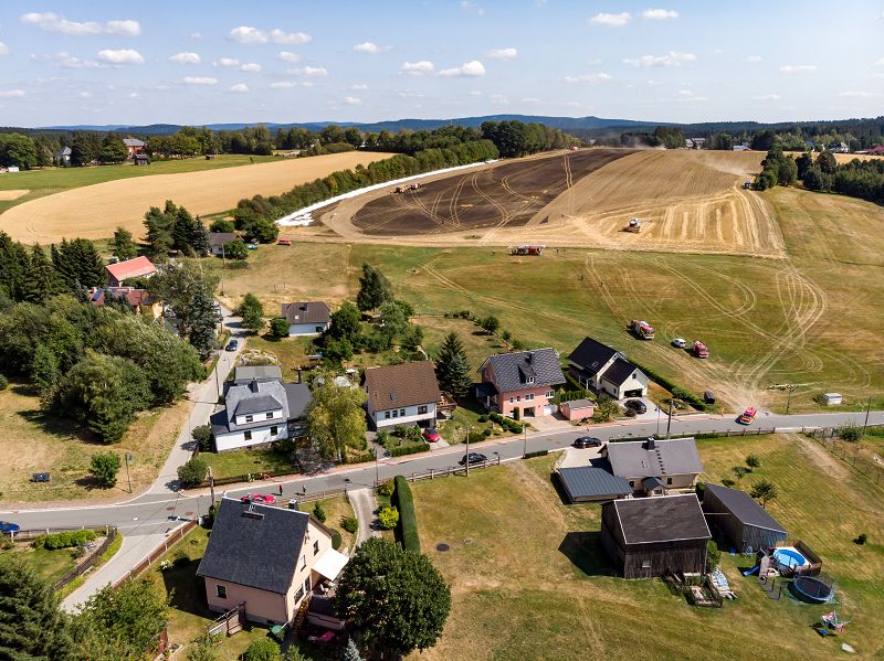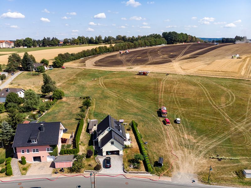 Feldbrand auf einem Getreidefeld hinter den beiden Sportplätzen. Vermutlich ausgelöst durch einen Mähdrescher kam es zum Entzünden des Strohfeldes. Die Brandwalze breitete sich rasend schnell in Richtung Siehdichfürer Straße und dem dort am Rand stehenden Einfamilienhaus aus. Aber auch in der gegenrichtung zur Muldenberger Straße bewegte sich die Feuerwalze. Mit der Grünbacher Wehr allein, wäre dieser Einsatz nicht zu schaffen gewesen!