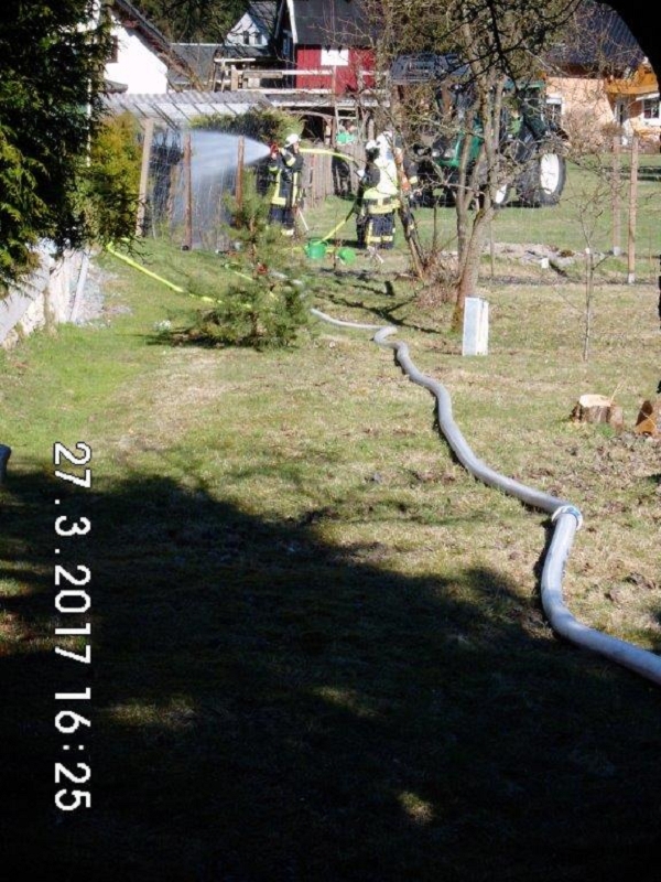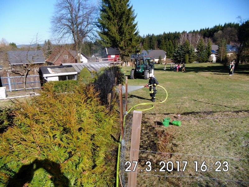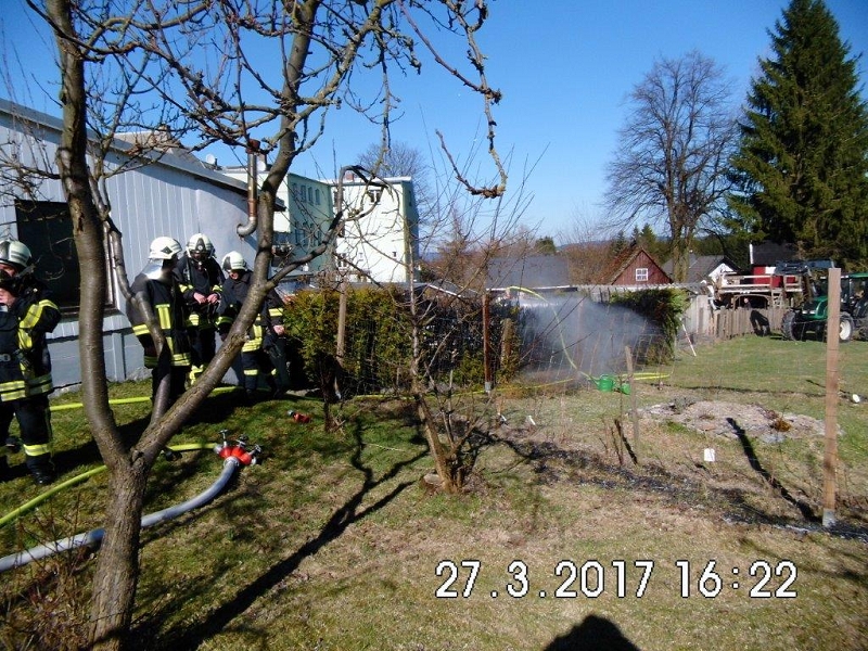 Zu einem Vollalarm mit dem Stichwort "Brand klein" wurden die Kameraden der Ortsfeuerwehr Grünbach alarmiert. Nach nur wenigen Minuten war das erste Einsatzfahrzeug an der Falkensteiner Straße angekommen. Anrückende Einsatzkräfte aus Richtung Falkenstein sahen schon die weiß-graue Rauchsäule in einem Hinterhof aufsteigen und ahnten nichts Gutes.