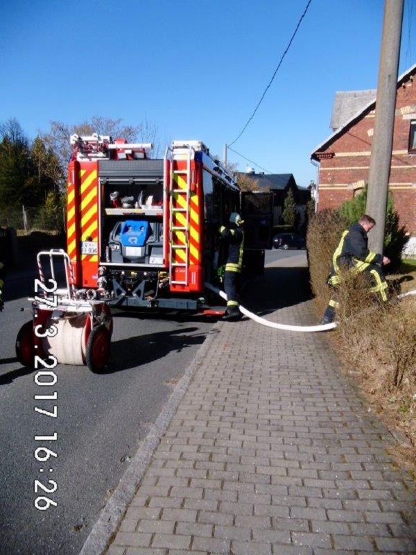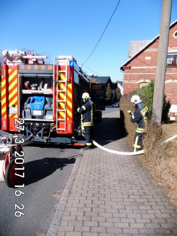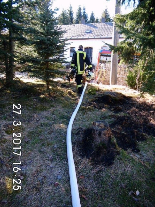 Durch Unachtsamkeit geriet einem Grünbacher Bürger eine Hecke in Brand und breitete sich in Sekundenschnelle aus. Nur durch das besonnene sofortige Eingreifen der Anwohner mit Gartenschlauch und mehreren Pulverlöscher konnte der Heckenbrand bis zum Eintreffen der Rettungskräfte in Schach gehalten werden. Die 2000 Liter Löschwasser des HLF 20 reichten somit aus, die restlichen Flammen abzulöschen.