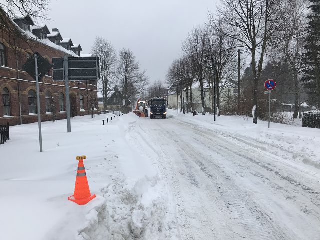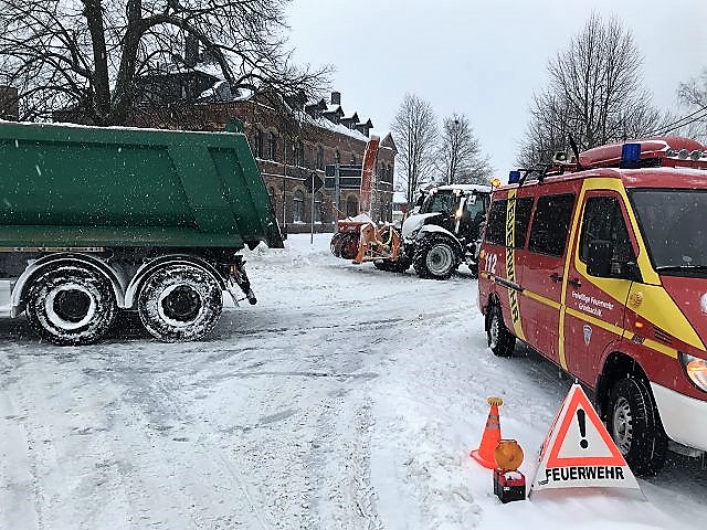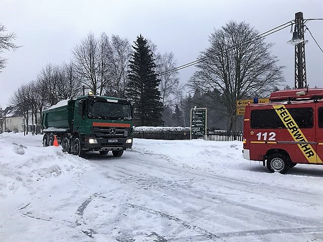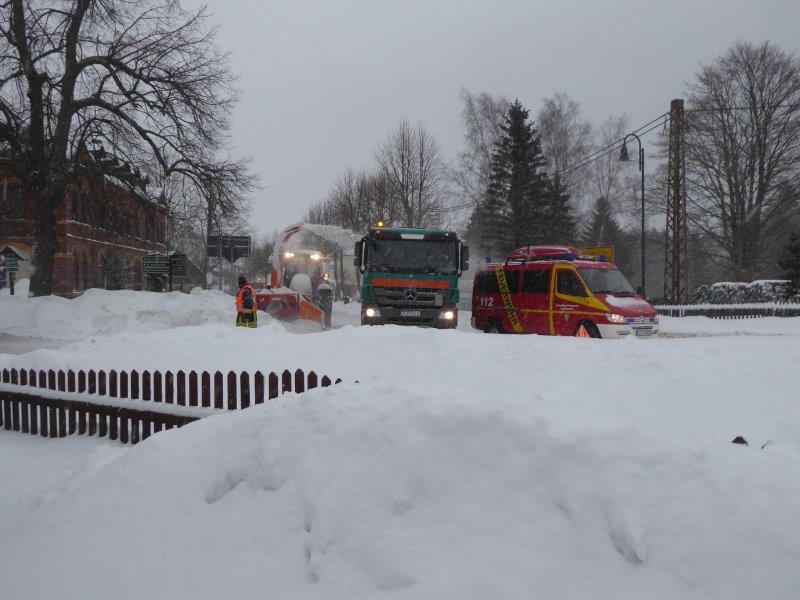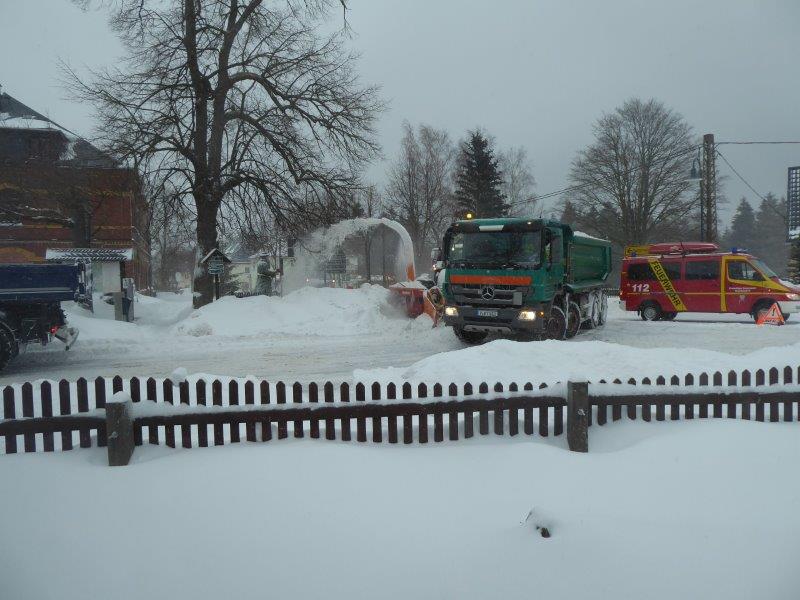 Wehrleiter-Stellvertreter Kamerad Pöhler hat für die erste Schicht insgesamt 4 Kameraden eingeteilt. Zwei Kameraden fuhren Schneepflug und LKW, die beiden anderen sperrten Abschnittsweise die Straße um das An- und Abfahren der LKW`s und den Schneefräsenbetrieb durch den Ort überhaupt zu ermöglichen. Auch Bürgermeister Ralf Kretzschmann zeigt Flagge und stand den ganzen Tag mit den Kameraden auf den Straße und sorgte mit dafür, dass alles reibungslos verlief.