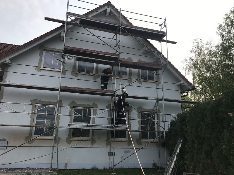Ein verletzter Putzarbeiter mit Kreislaufproblemen auf einem Baugerüst. Treffender konnten die Kameraden das Thema Absturzsicherung an diesem Ausbildungtag nicht trainieren. Das Feuerwehrhaus ist gerade auf Grund der Sanierungsarbeiten eingerüstet.