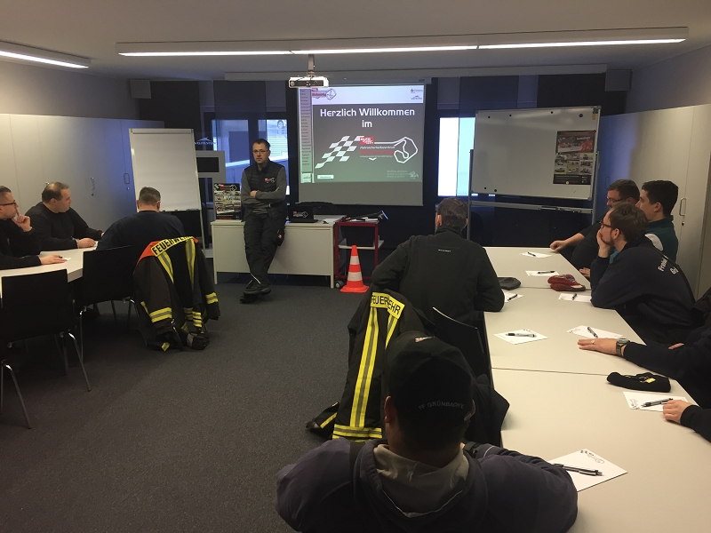 Beginn des Trainings war zunächst eine theoretische Einweisung in die Praxis des LKW-Fahrens. Untersteuern, Übersteuern, Bremsen und Hangabtriebskräfte- all das Wissen wurde durch den Instruktor Sven Förster wieder einmal aufgefrischt. Förster, selbst Feuerwehrmann und im Beruf bei der Autobahnpolizei,hatte den richtigen Ton im Umgang mit den Maschinisten auf ihren roten Fahrzeugen. Nach einem Bremstraining, ging es in einen Slalomkurs, dann zum Ausweichtraining, ehe jeder die Fliehkräfte seines Fahrzeuges beim Kreisfahren ausreizen konnte.
