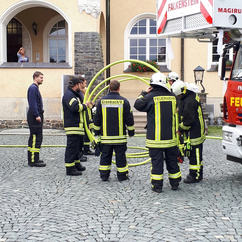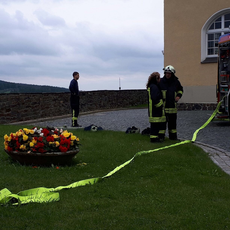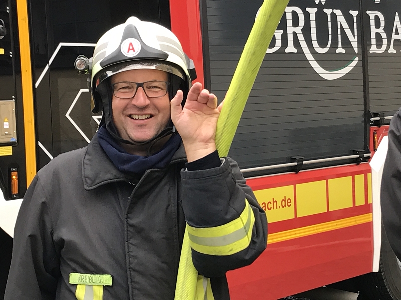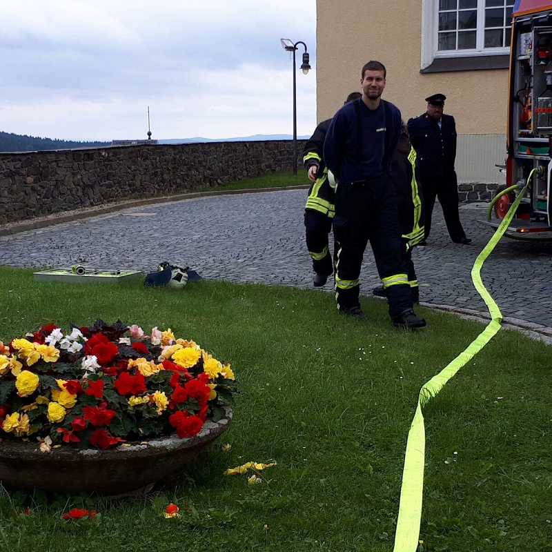 Und der traditionelle Gang durch den Regennebel aus 2 Hohlstrahlrohren durfte natürlich auch nicht nicht fehlen, ehe es zum Schluß mit dem Feuerwehrfahrzeug zum Fototermin ging.