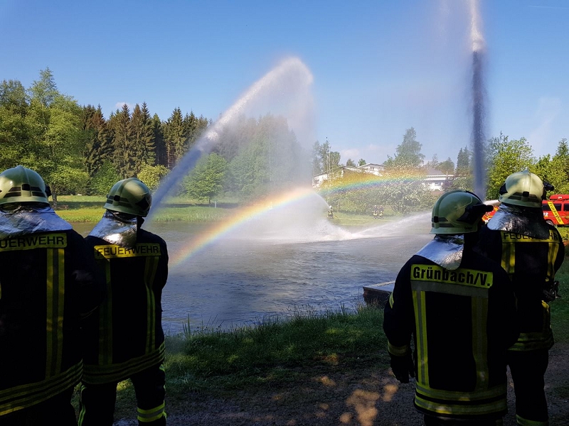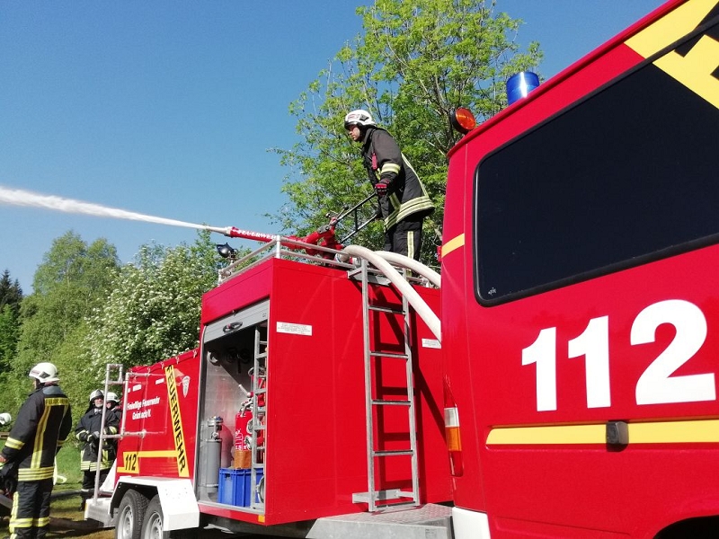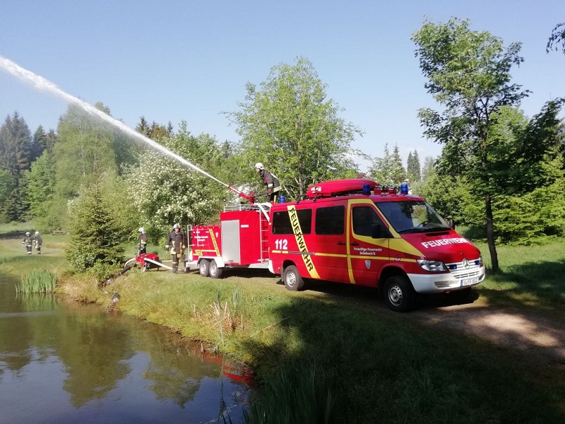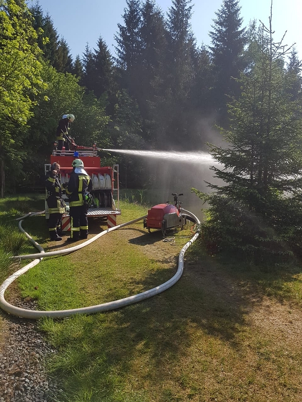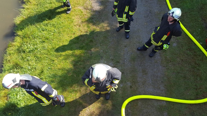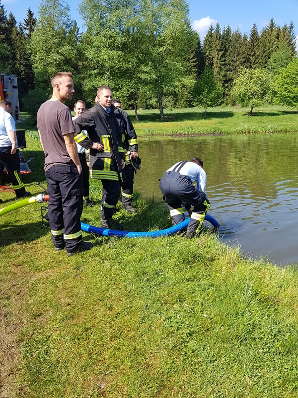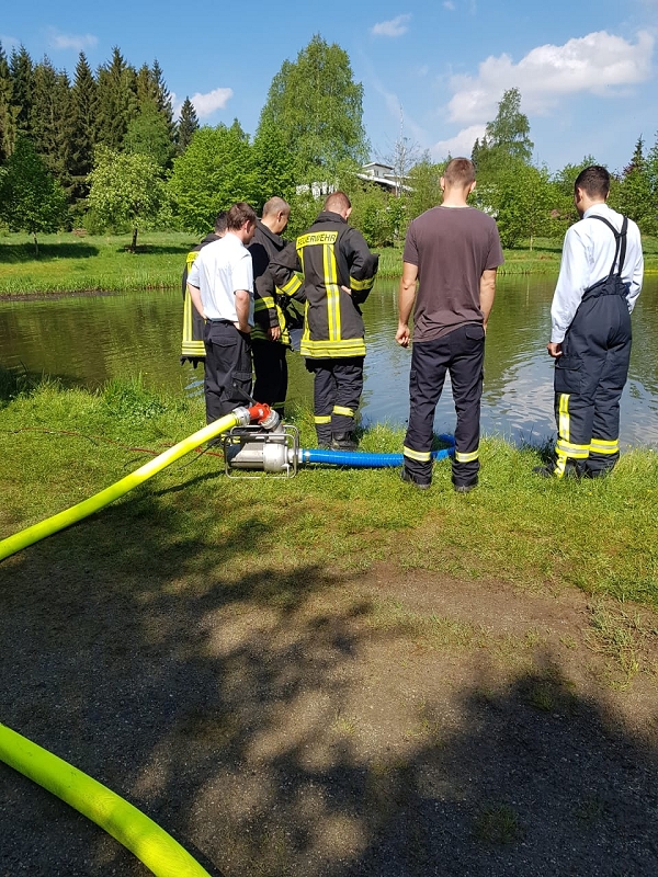 Zum Ausbildungsdienst kurz nach dem Männertag kamen gut zwei Einsatzgruppen, was die Ausbildung mit zwei Fahrzeugen in Vollbesetzung erlaubte. Geübt wurde die Wasserförderung an beiden Fahrzeugen. Zunächst übten beide Einsatzgruppen selbstständig, später wurde dann die im Einsatz übliche Variante mit Einspeisung des HLF durch Wasser über lange Wegestrecken durch den Sprinter geübt. Beides klappte perfekt und die Pumpen konnten beweisen, wofür sie entwickelt wurden, wenngleich beim HLF das zweite mögliche Saugschlauchpaar fehlte.