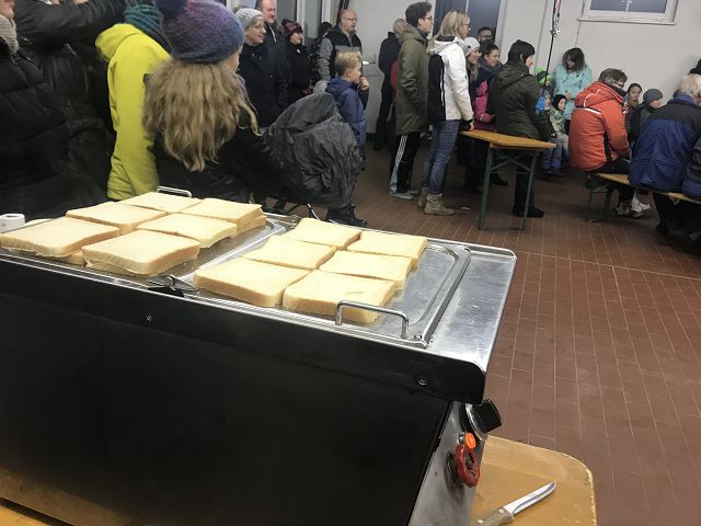Die Feuerstelle vor dem Feuerwehrhaus kämpfte auch tapfer gegen die Regentropfen. Zum Glück gab es den wärmenden Glühwein und den Punsch im warmen Feuerwehrhaus. Dort durfte auch die Wiener für alle nicht fehlen.
