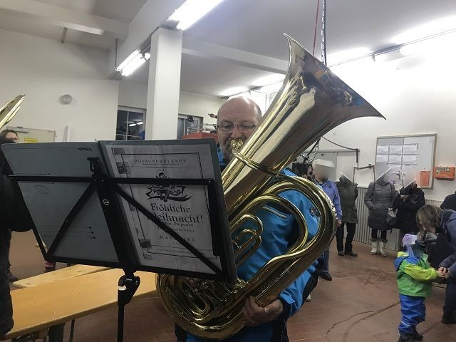 Die Bläser des Posaunenchors der landeskirchlichen Gemeinschaft spielte stimmungsvolle Weihnachtsmusik und wurden nur ab und zu vom Martinshorn des Feuerwehrautos gestört, welches seine stolzen Mitfahrer eine Runde durch unser Dorf fuhr! Und die Schlange der Interessierten Kinder riss einfach nicht ab, obwohl alle im Regen standen.