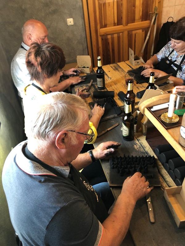 Wir wollten uns in die Geheimnisse des original "Weihrichkarzl" einweihen lassen. Dafür ging es in die "Hexenküche" von Kurt Huss, dem Begründer der Neudorfer Karzlherstellung- seit 1930! Ausgestattet mit schwarzen Kittelschürzen tauchten die Hände aller Vereinsmitglieder in die Emailleschüsseln. Diese waren gefüllt mit feinsten Buchenholzmehl, welches vorher Grillkohle war. Das Bindemittel, die Kartoffelstärke überraschte die meisten Hobbyköche, mehr war nicht drin in den Weihrichkerzln. Na doch, Vanillezucker, Weihrauch, Benzoe und der selbst gewählte Geruchsstoff ergänzten das Breigemenge. Dieses musste dann zu einem Teig geformt und als Kuchen ausgerollt werden. Der größte Spaß für Groß und Klein und so manche schwarze Hand landete zum Schweiß abwischen im Gesicht oder versehentlich an der weißen Hose.