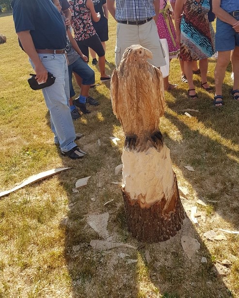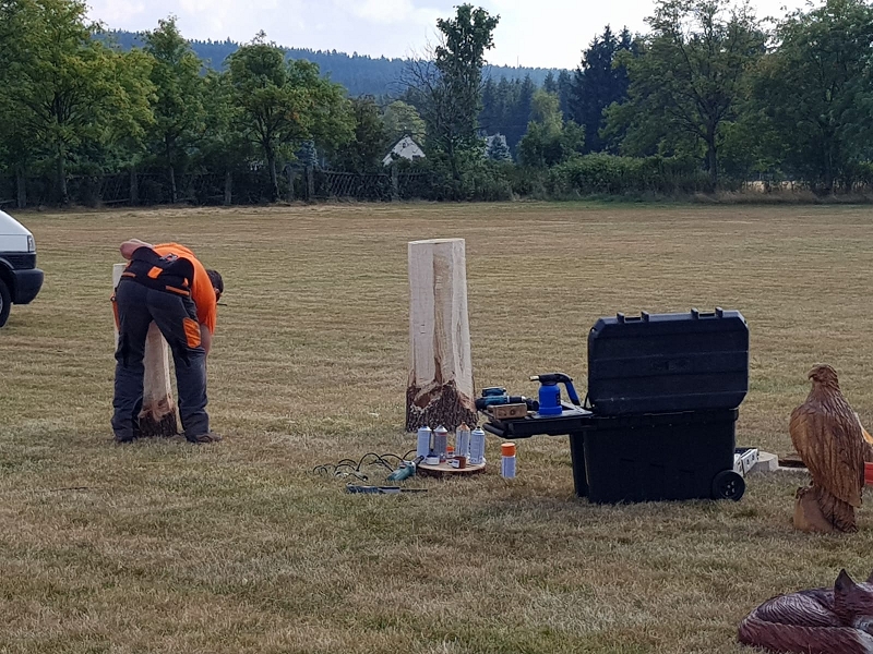 Im Kettensägenlärm schnitzten 6 Künstler in der prallen Sonne des Festplatzes ihre Figuren. Es entstanden Adler, Eulen und vieles mehr. Das meiste fand bei der anschließenden Versteigerung einen neuen Besitzer!