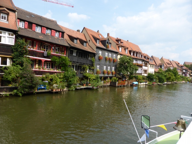 Mit dem Wetter hatte wir erneut einen Glücksgriff gemacht! Sonnenschein bis in den Abend. Wir müssen unsere Sache im letzten Jahr offensichtlich ganz gut gemacht haben, daß man uns mit diesem Wetter belohnte! In Bamberg an der Konzerthalle angekommen, ging es zu Fuß an den alten Fischerhäuser vorbei zur Bootsanlegestelle im Stadtzentrum. Dort hatten wir eine Bootsrundfahrt auf der Regnitz und dem Bamberger Hafen gebucht. Das bestellte komplette Unterdeck wurde aber kaum genutzt, den der Sonnenschein lud förmlich auf das Oberdeck ein.