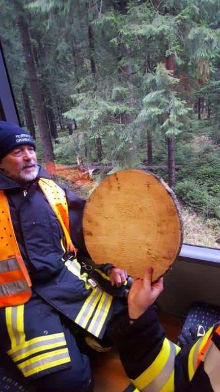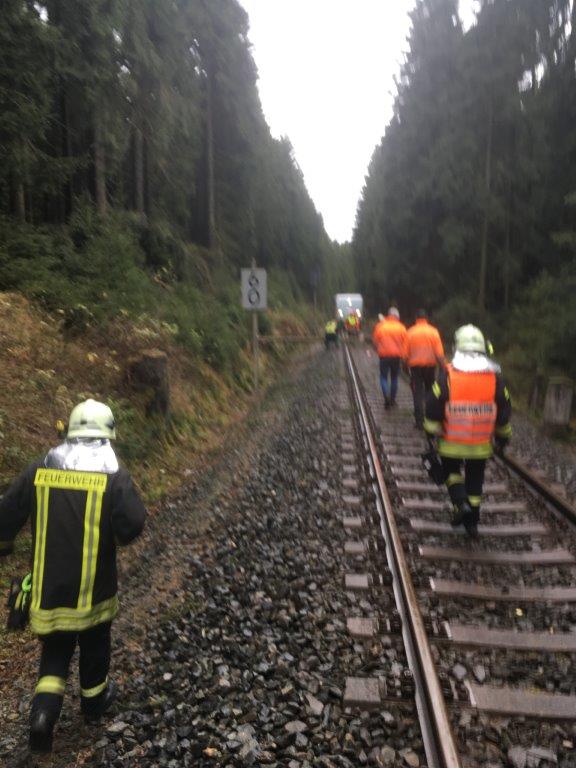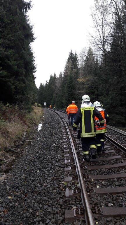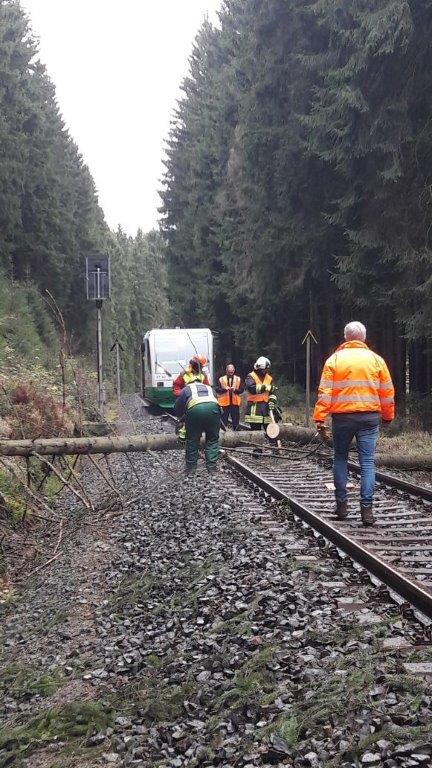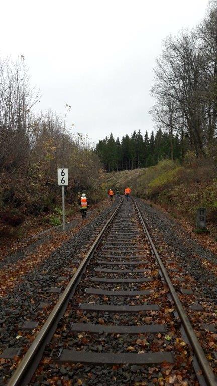 Durch die Bahn wurde die FF Grünbach herangezogen um umgestürzte Bäume auf der Bahnlinie zu beseitigen. Bis Bahnkilometer 5,0 von Falkenstein kommend beseitigte die FF Falkenstein umgestürzte Bäume. Danach bleib wieder ein Triebwagen mit Passagieren kurz vor Grünbach stecken. Wir machten uns zu Fuss vom Haltepunkt Grünbach aus auf den Weg zum Triebwagen und beseitigten den Baum. Danach fuhren wir mit dem Triebfahrzeug bis zum Haltepunkt Muldenberg und beseitigten auf der Strecke weitere 3 Bäume. In Muldenberg übernahm die FF Muldenberg und wir kehrten nach einem langen Einsatz-Tag wieder zum Gerätehaus zurück. Nach einem Kaffee konnte das Equipment gereinigt und wieder fit gemacht werden, und die Einsatzkräfte konnten das Gerätehaus verlassen.