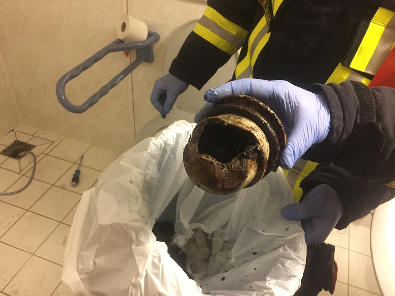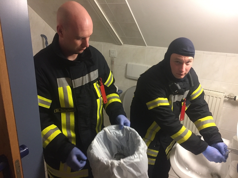 Dort brannte es in einem Bewohnerbad. Sofort zueilendes Pflegepersonal konnte die etwa 1 Meter hohe Flamme aus dem Siphon der Dusche bereits beim Eintreffen der Einsatzkräfte löschen. Warum der Abfluss brannte, konnte von den EK nicht abschließend geklärt werden. Beim Entfernen des völlig verbrannten Geruchsverschlusses wurde jedoch eine größer Menge Brandreste und Asche gefunden. Die beiden Bewohner wurden dann von den Einsatzkräften mit dem Personal evakuiert. Eine der Bewohner musste später durch den Rettungsdienst zur Kontrolle ins Krankenhaus verbracht werden. Auch in dem Zimmer unterhalb des Brandherdes wurden die beiden Bewohner in ein anderes Zimmer gebracht, da auch dort der Brandgeruch festgestellt wurde.