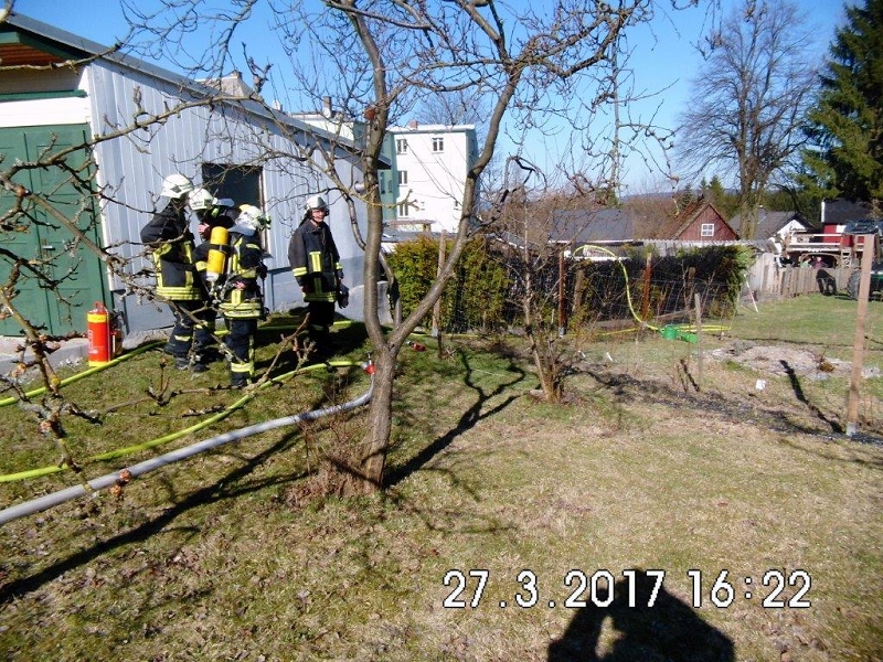 Zu einem Vollalarm mit dem Stichwort "Brand klein" wurden die Kameraden der Ortsfeuerwehr Grünbach alarmiert. Nach nur wenigen Minuten war das erste Einsatzfahrzeug an der Falkensteiner Straße angekommen. Anrückende Einsatzkräfte aus Richtung Falkenstein sahen schon die weiß-graue Rauchsäule in einem Hinterhof aufsteigen und ahnten nichts Gutes.