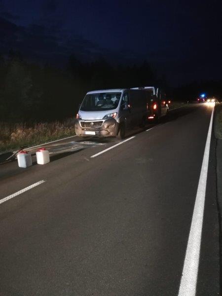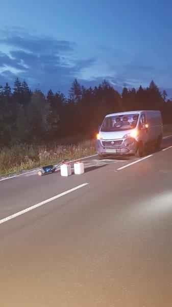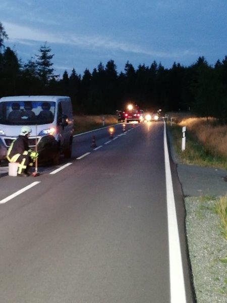 Nach einer Kollision mit einem Reh durch einen Transporter mit Kurieraufgaben, kam es zu auslaufenden Betriebsflüssigkeiten über eine Strecke von etwa 100 m auf der S 304 von Muldenberg nach Grünbach. Ein Personenschaden war zum Glück nicht zu verzeichnen, das Reh verendete aber durch den Aufprall.
