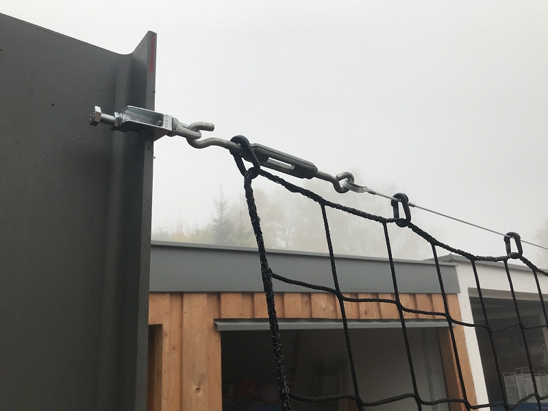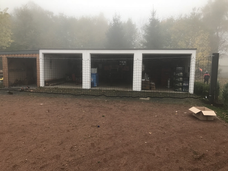 An den Geragen wurde eine weitere Maßnahme zu Ende gebracht. Über den gesamten Sommer liefen Maßnahmen zur errichtung eines Ballfangnetzes zum Schutz der Garagentore. Heute konnte die Arbeit abgeschlossen werden. Stahlträger wurden für das Spannseil einbetoniert und auch das aus Spenden gekaufte Ballfangnetz mit Gewichtseinlageband wurde angepasst und montiert. Es schützt in Zukunft beim Fußball- und Volleyspielen die empfindlichen Garagensektionaltore. Während der Sportnutzung ist das Netz vor die Garagen zu ziehen.