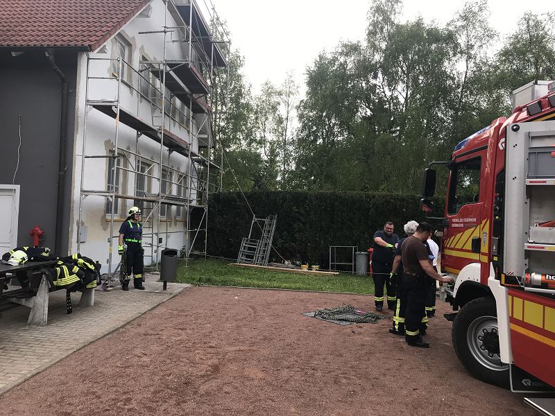 Ein verletzter Putzarbeiter mit Kreislaufproblemen auf einem Baugerüst. Treffender konnten die Kameraden das Thema Absturzsicherung an diesem Ausbildungtag nicht trainieren. Das Feuerwehrhaus ist gerade auf Grund der Sanierungsarbeiten eingerüstet.