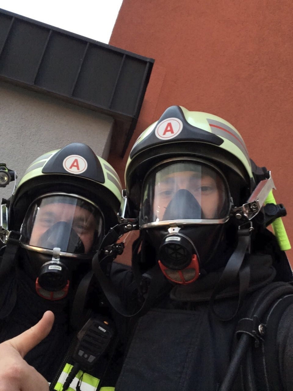 Leider funktionierte das Nebelgeräte nicht ordentlich. Deshalb mussten die Einsatzkräfte mit Folienbeutel über den Köpfen arbeiten um überhaupt die Vernebelung etwas simulieren zu können. Dadurch war natürlich die Sicht NULL und auch der Einsatz der Wärmebildkamera nicht möglich.