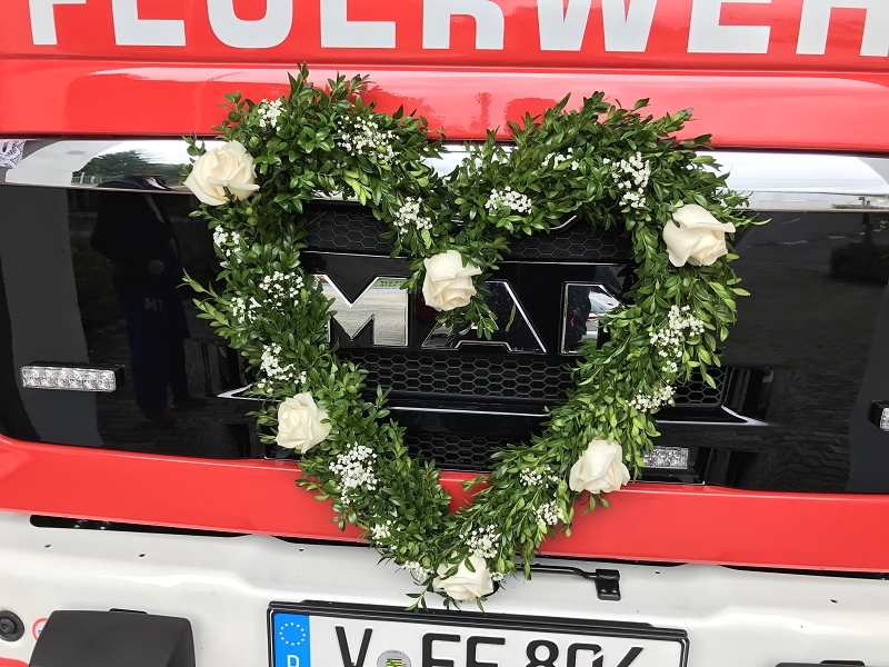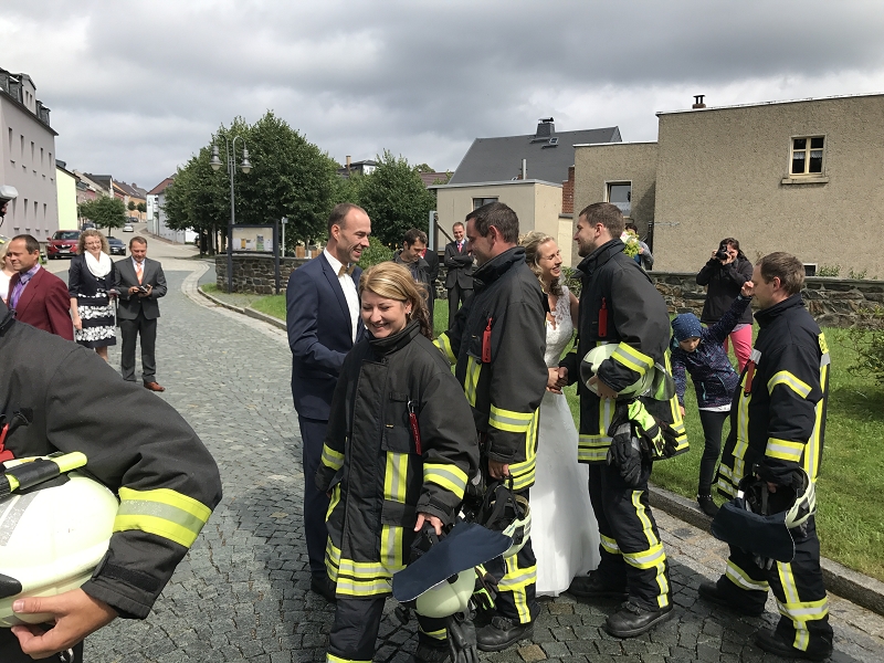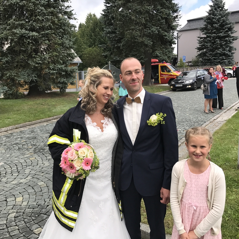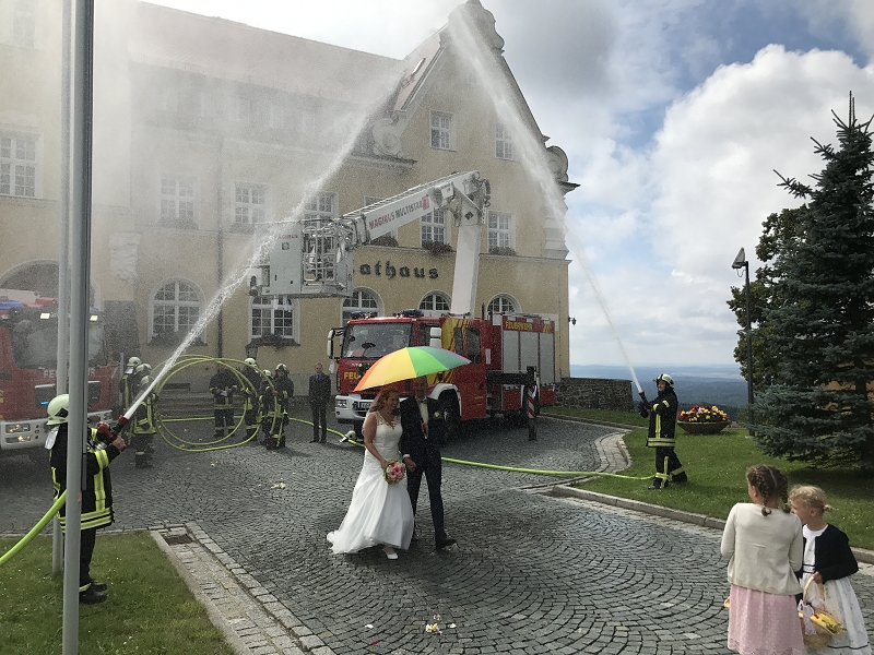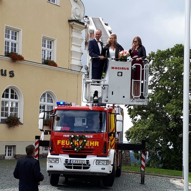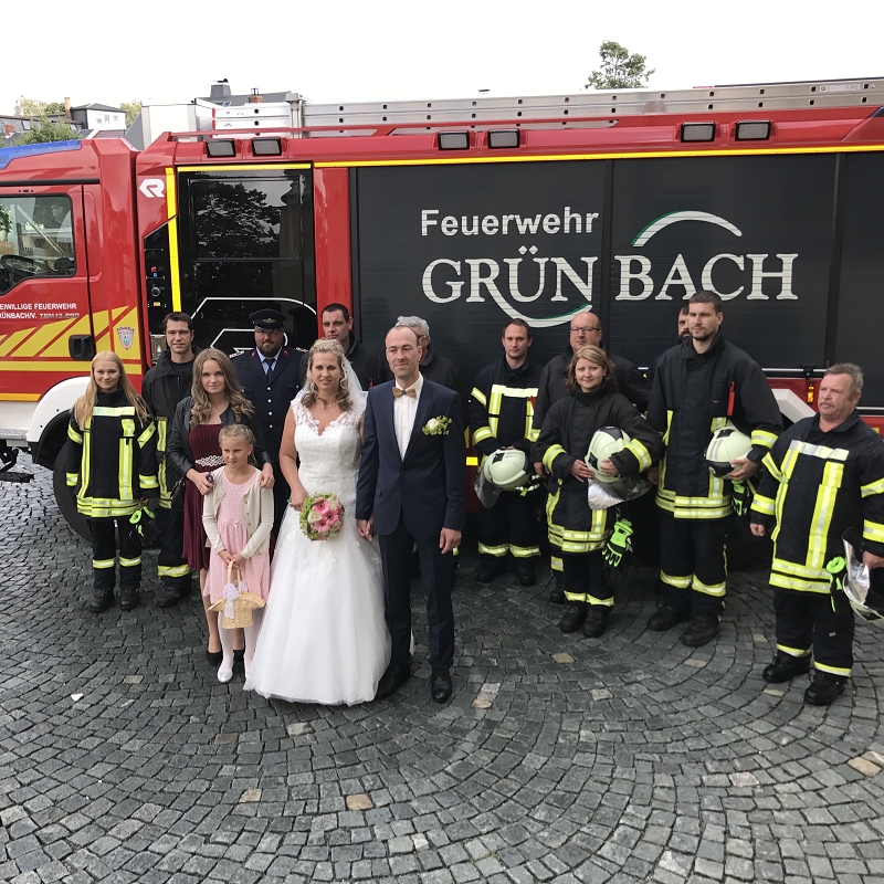 Ronny und Daniela sind ab heute ein Paar und mit ihren beiden Töchtern nun eine Familie mit Trauschein! Ronny wollte das ganze Programm Feuerwehr rund um seine Hochzeit und bekam den Rahmen durch seine Kameradinnen und Kameraden auch würdig präsentiert! Ein nagelneues HLF20 und ein Hubrettungsfahrzeug standen für die beiden bereit.
