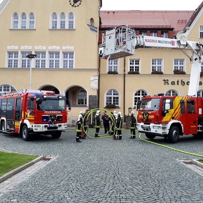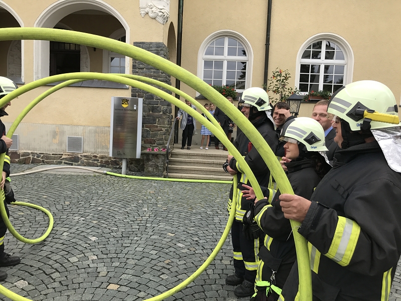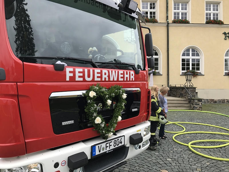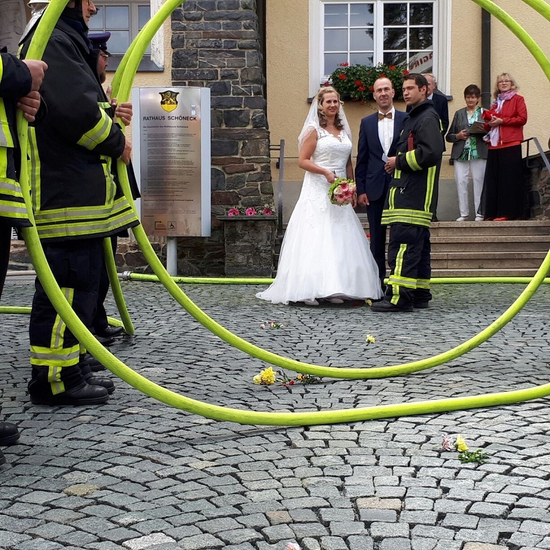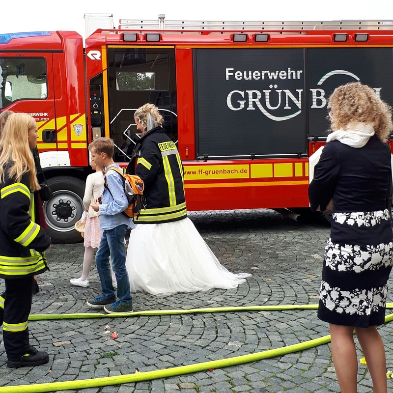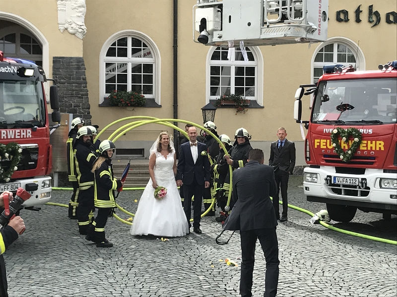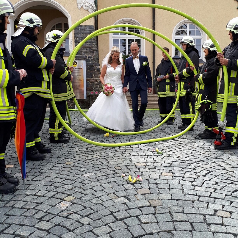 Ronny und Daniela sind ab heute ein Paar und mit ihren beiden Töchtern nun eine Familie mit Trauschein! Ronny wollte das ganze Programm Feuerwehr rund um seine Hochzeit und bekam den Rahmen durch seine Kameradinnen und Kameraden auch würdig präsentiert! Ein nagelneues HLF20 und ein Hubrettungsfahrzeug standen für die beiden bereit.