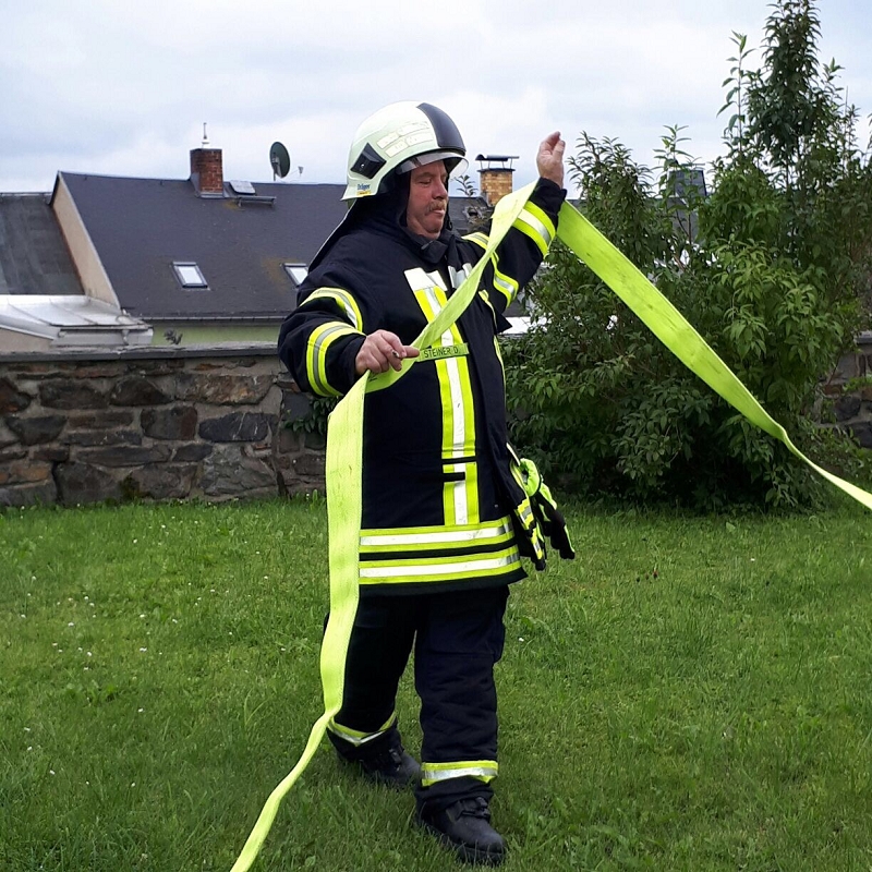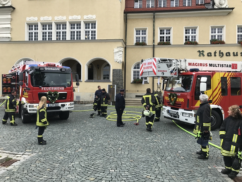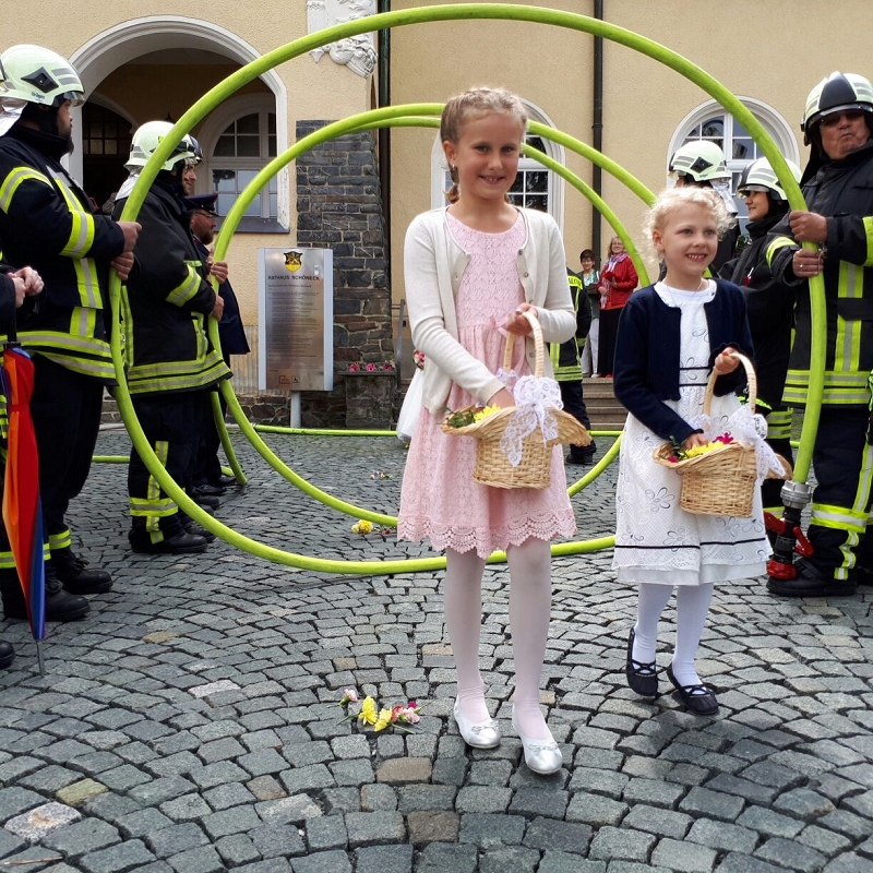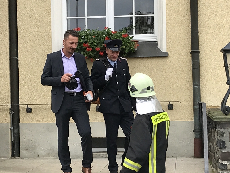 Und der traditionelle Gang durch den Regennebel aus 2 Hohlstrahlrohren durfte natürlich auch nicht nicht fehlen, ehe es zum Schluß mit dem Feuerwehrfahrzeug zum Fototermin ging.
