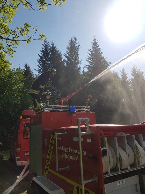 Zum Ausbildungsdienst kurz nach dem Männertag kamen gut zwei Einsatzgruppen, was die Ausbildung mit zwei Fahrzeugen in Vollbesetzung erlaubte. Geübt wurde die Wasserförderung an beiden Fahrzeugen. Zunächst übten beide Einsatzgruppen selbstständig, später wurde dann die im Einsatz übliche Variante mit Einspeisung des HLF durch Wasser über lange Wegestrecken durch den Sprinter geübt. Beides klappte perfekt und die Pumpen konnten beweisen, wofür sie entwickelt wurden, wenngleich beim HLF das zweite mögliche Saugschlauchpaar fehlte.