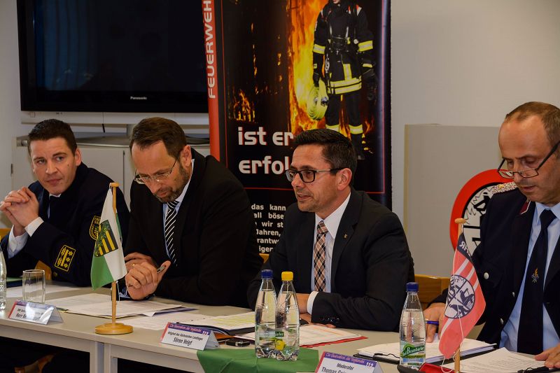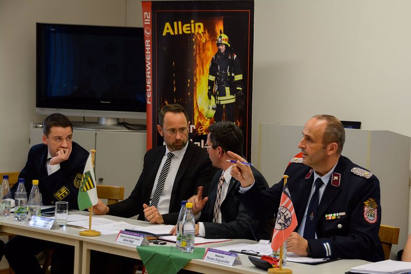 Sie alle konnten mit zwei kompetenten Gesprächspartner in den gewünschten Dialog gehen. Geschäftsstellenleiter des Kreisfeuerwehrverbandes Daniel Löwenhagen freute sich über das Kommen von Landesbranddirektor Rene`Kraus und Ministerialrat Dirk Benkendorf vom Innenministerium Sachsens.