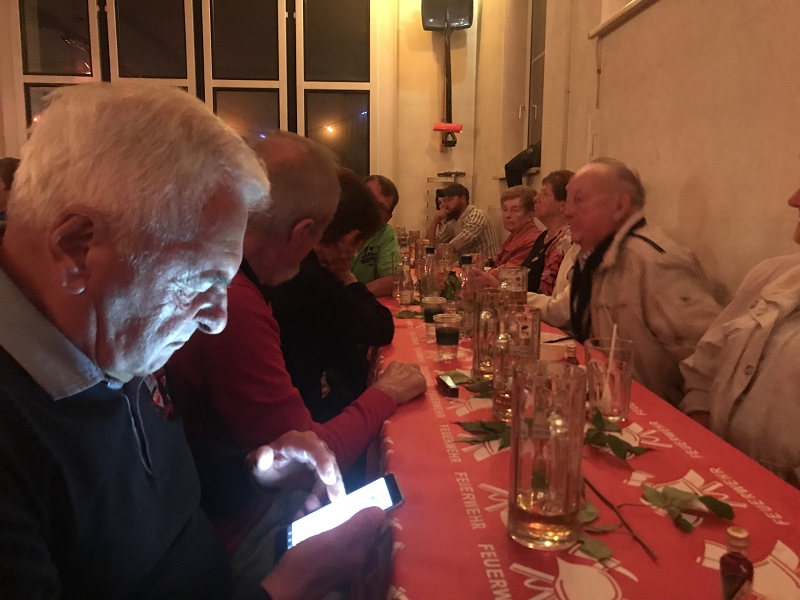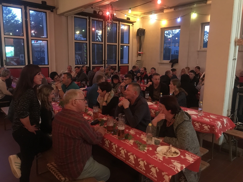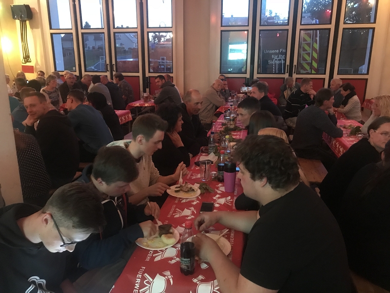 Und so war es mehr als richtig, noch einmal alle zu einem gemütlichen Abend bei Speis und Trank einzuladen. Nach dem Motto - bedient haben wir genug -heute ist Selbstbedienung! Und so rollte unser Hähnchenbratwagen aus dem Heinsdorfergrund mit leckeren Hähnchen und Mutzbraten auf den zahlreichen Spießen an und sorgte vor dem Feuerwehrhaus für manche Verwirrung wenn Touristen die vorbei liefen doch kein Hähnchen bekommen konnten.