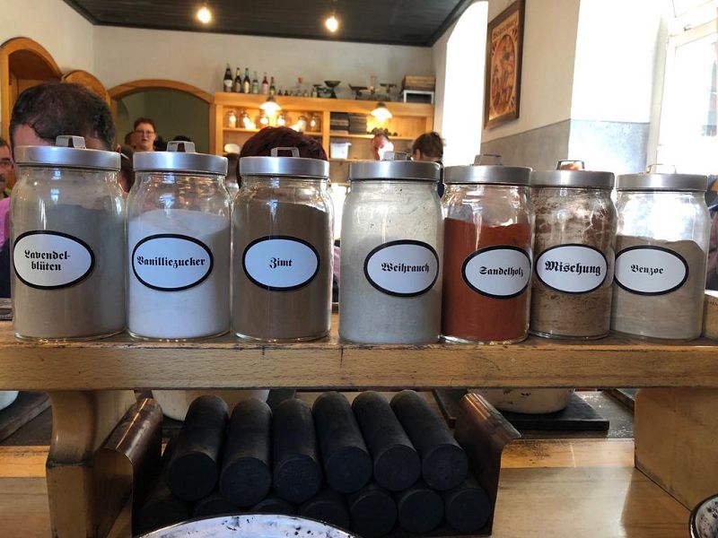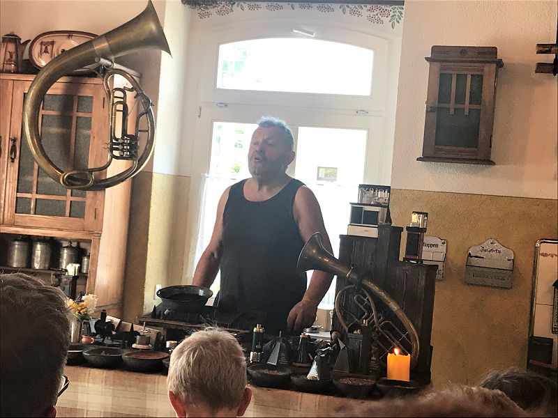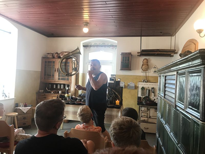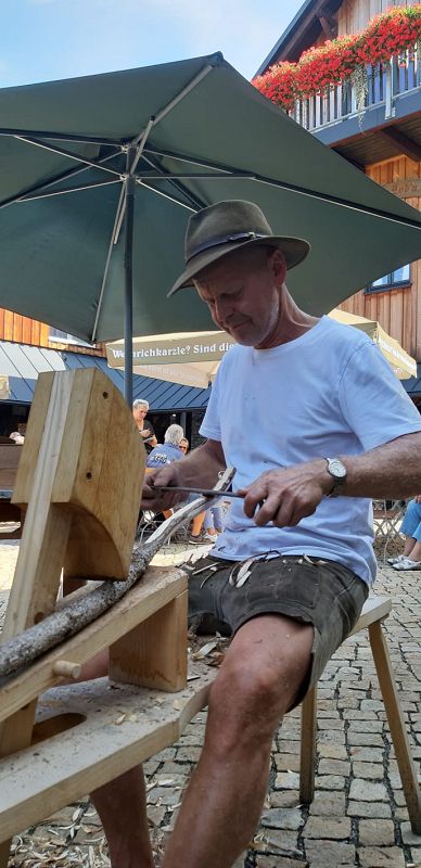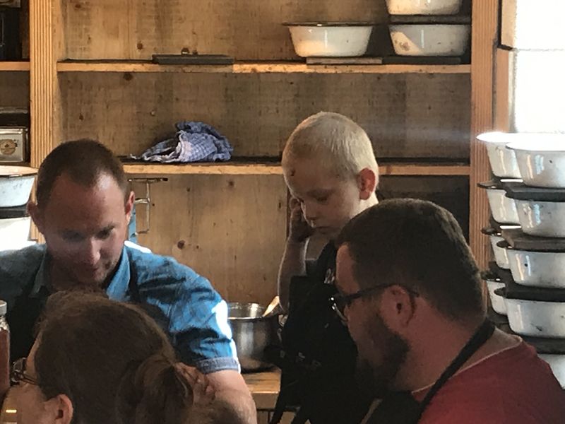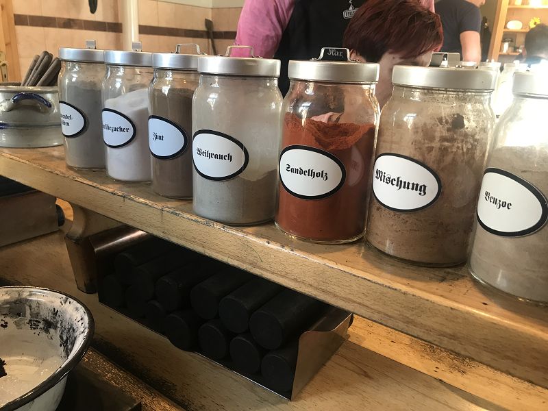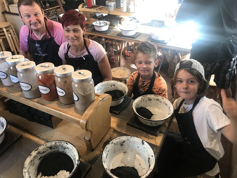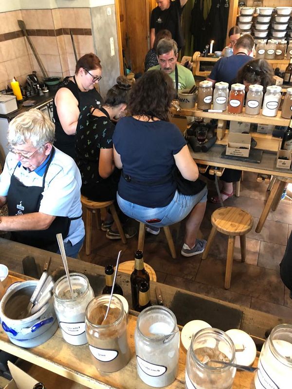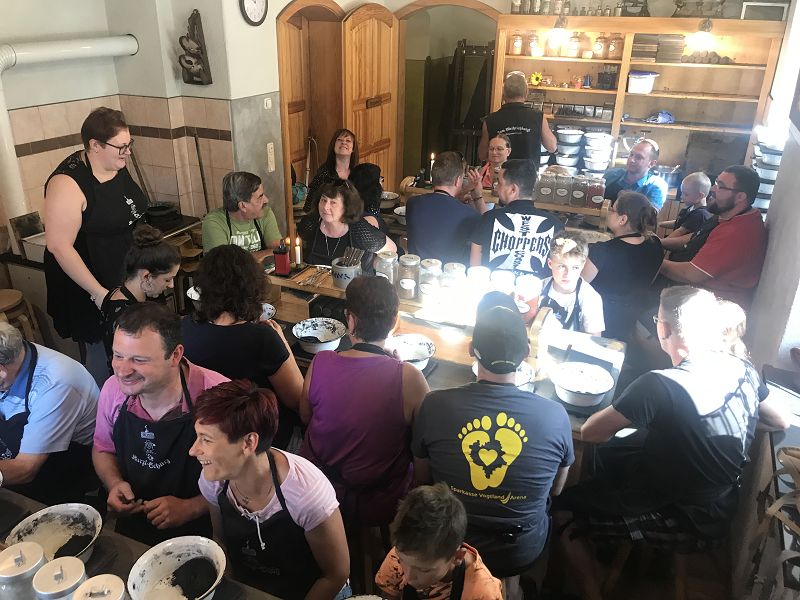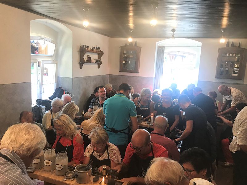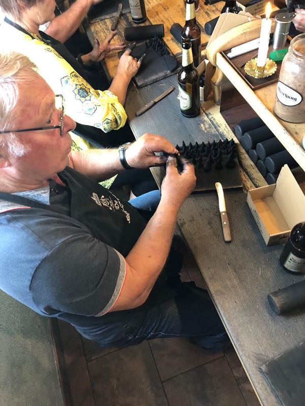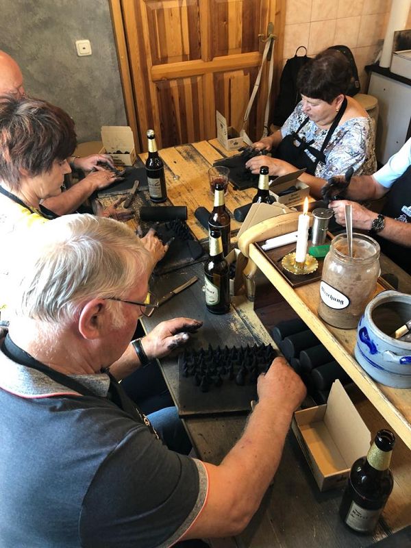 Wir wollten uns in die Geheimnisse des original "Weihrichkarzl" einweihen lassen. Dafür ging es in die "Hexenküche" von Kurt Huss, dem Begründer der Neudorfer Karzlherstellung- seit 1930! Ausgestattet mit schwarzen Kittelschürzen tauchten die Hände aller Vereinsmitglieder in die Emailleschüsseln. Diese waren gefüllt mit feinsten Buchenholzmehl, welches vorher Grillkohle war. Das Bindemittel, die Kartoffelstärke überraschte die meisten Hobbyköche, mehr war nicht drin in den Weihrichkerzln. Na doch, Vanillezucker, Weihrauch, Benzoe und der selbst gewählte Geruchsstoff ergänzten das Breigemenge. Dieses musste dann zu einem Teig geformt und als Kuchen ausgerollt werden. Der größte Spaß für Groß und Klein und so manche schwarze Hand landete zum Schweiß abwischen im Gesicht oder versehentlich an der weißen Hose.