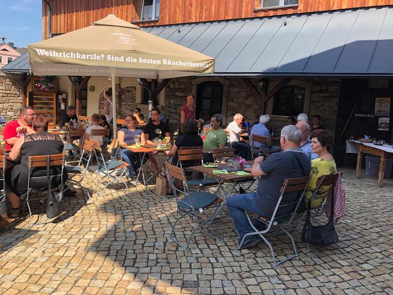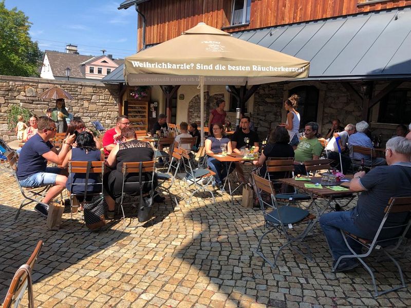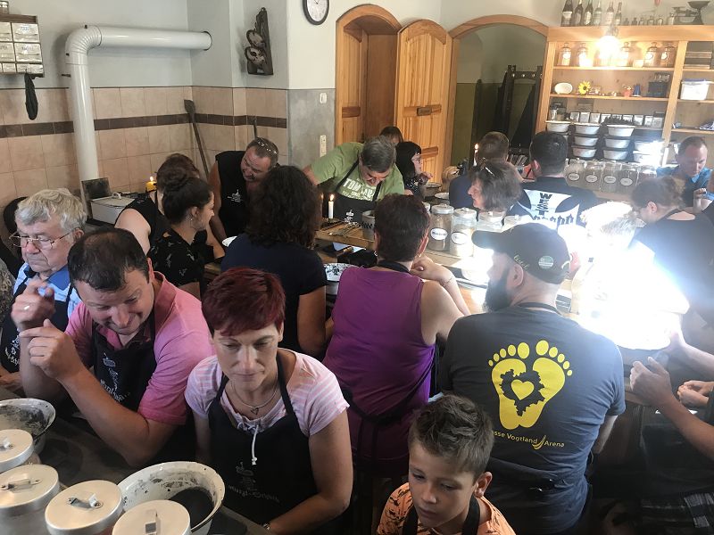 Für alle Vogtländer und natürlich Erzgebirger ein Begriff! Ziel war der Dreiseitenhof der Manufaktur HUSS mit Pension- Selbermach-Werkstatt, Gastronomie und Laden. Frisch gestärkt durch Knacker und Semmel, organisiert von Werner und Beate gings in Raacherkerzelgemenge.