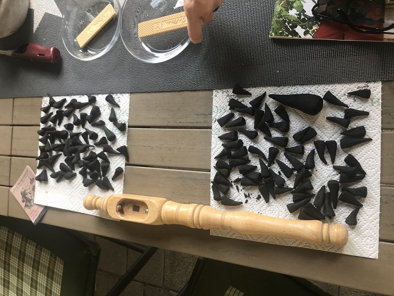 Geschickt zugeschnitten, rollte dann jeder seine eigenen Räucherkerzen aus. Entstanden sind so manche Kuriositäten und doch erkannte man in den meisten Kartons das Ergebnis- echt handgemachte Weihrichkarzl. 60 bis 70 Stück waren es dann am Ende, wer keine Großraumkerzen formte.