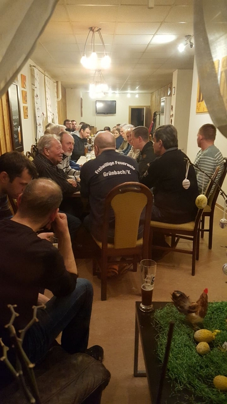 Fast 30 Kameradinnen und Kameraden aus der Einsatzabteilung und der Alters- und Ehrenabteilung trafen sich am Gründonnerstag, zum gemütlichen Abend im Wirtshaus "Cafe Bohne" in Grünbach. Es gehört zur jährlichen Traditionen, vor den Feiertagen nochmal alle an einen Tisch zu bringen, zur Festigung unserer Kameradschaft! Und viele haben es sich nicht nehmen lassen, vor allem die Alterskameraden waren bis auf einen Kameraden vollständig anwesend! Klasse! Für unsere Traditionsabteilung eine Chance das eine oder andere neue Gesicht in unserer Einsatzabteilung kennen zu lernen und das Neustes über unsere Feuerwehr zu erfahren.