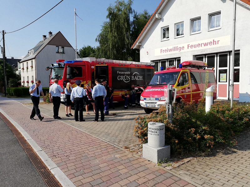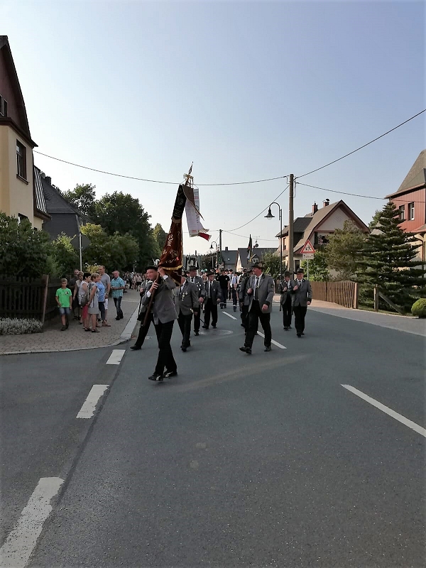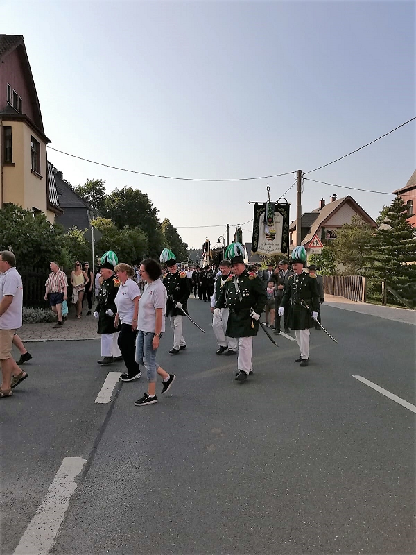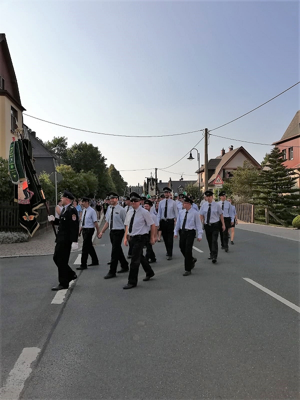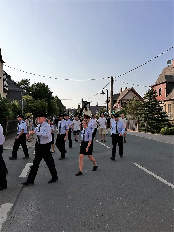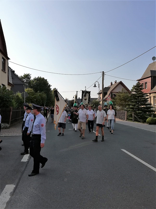 Beim Festumzug aller Vereine beteiligten sich trotz aller Schweißperlen auf der Stirn alle! Am Festplatz angekommen, knallten die Donnerkanonen ehe der Schriftführer des Feuerwehrvereins Klaus Körner die Eröffnungsrede mit dem Bürgermeister Ralf Kretzschmann vortrugen konnten.