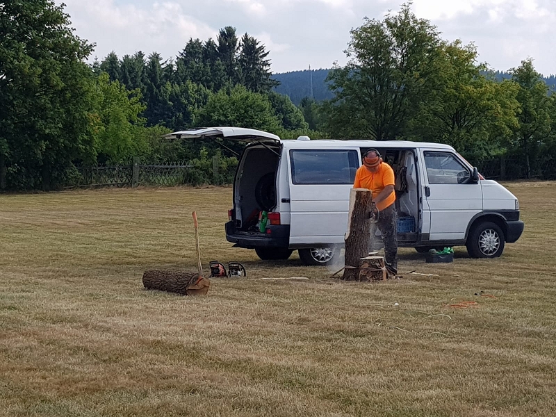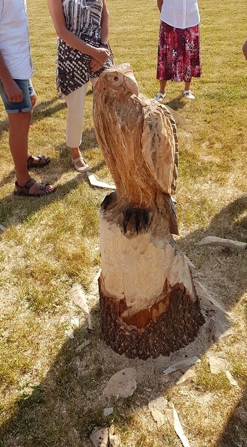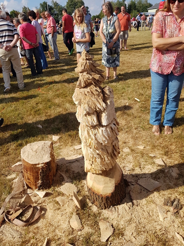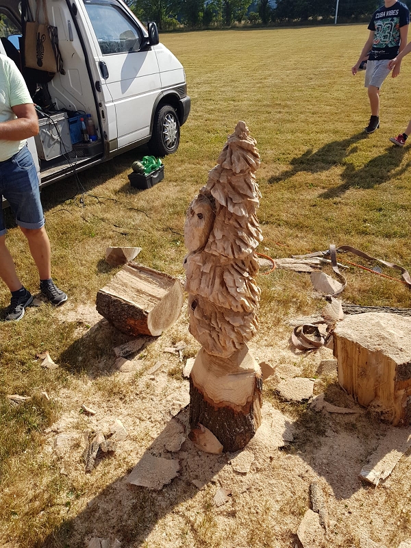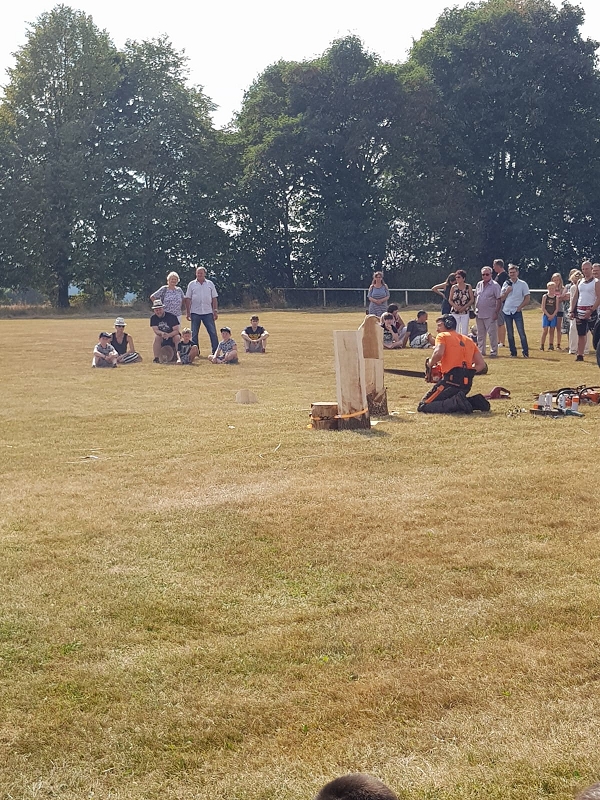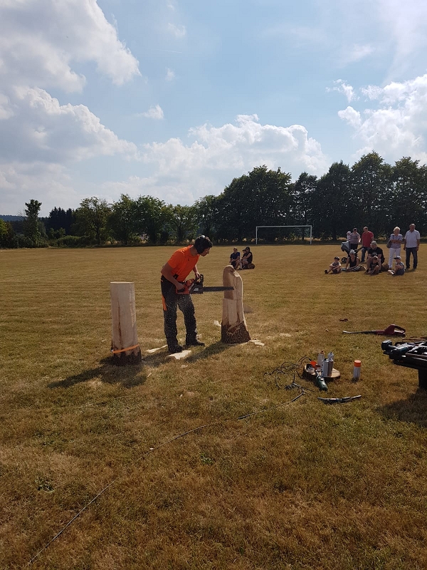 Im Kettensägenlärm schnitzten 6 Künstler in der prallen Sonne des Festplatzes ihre Figuren. Es entstanden Adler, Eulen und vieles mehr. Das meiste fand bei der anschließenden Versteigerung einen neuen Besitzer!