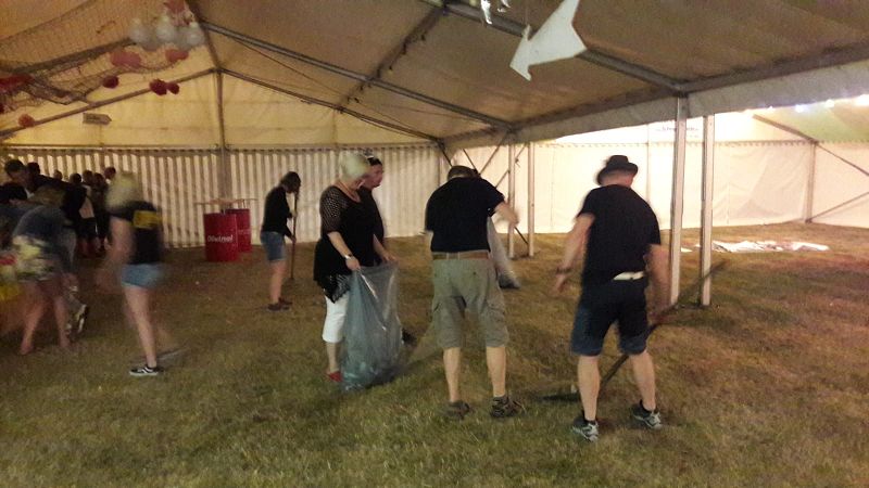 Schnell waren alle Garnituren nach der Devise "Viele Hände schnelles Ende" verpakt! Alle Werbeplakate wurden entfernt und die Zeltbeleuchtung bereits zu 40% abgebaut. Und auch sonst wurde versucht möglichst viel bereits für den morgendlichen Abbau vorzubereiten, wenn gleich man einigen Kirmeskämpfern die eine oder andere Konditionsschwäche anmerkte.