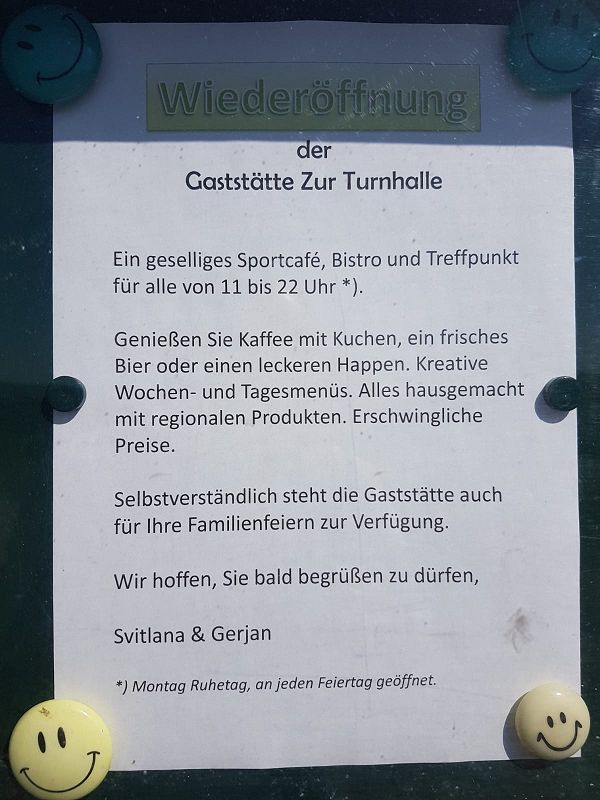 Es ist vollbracht! Alles hoffen und bangen nach einem neuen Betreiber für unsere Traditionsgaststätte am Sportplatz hat nun Erfolg! Seit gestern, anlässlich des Vereinsfestes der Grünbacher Vereine eröffneten Svitlana & Gerjan die Türen. Am Schaukasten haben die beiden schon alle Grünbacher über die Eröffnung informiert.