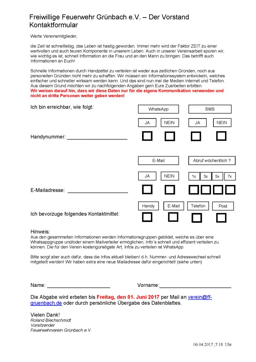 Um Informationen aller Art schneller an die Frau und den Mann, sprich an die Vereinsmitglieder zu bekommen, startet der Feuerwehrverein ein großangelegte Kontaktabfrage seiner seiner Mitglieder. Das Formular wird mit den Unterlagen zur Vereinsausfahrt ausgereicht. jeder kann sich das Formular aber auch schon jetzt herunter laden aund ausgefüllt zuarbeiten.
